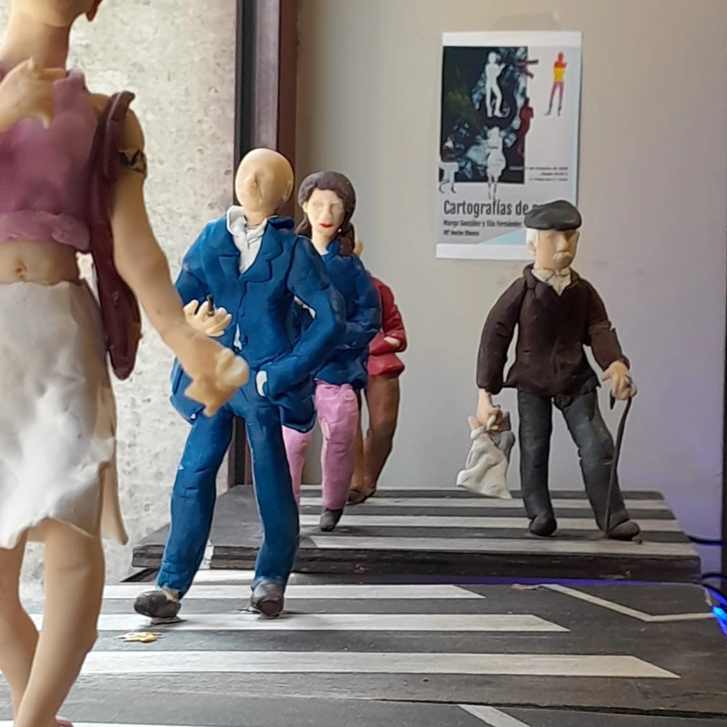 Estamos ante un recorrido por un territorio emocional tejido con pintura, collage y escultura, que explora la idea del paso y del rastro, introduciéndonos en la esencia de los “no lugares” descritos por Marc Augé a través de un motivo recurrente, los pasos de peatones. Espacios de tránsito donde innumerables historias se cruzan fugazmente y que aquí se convierten en el eje de una exploración artística. Los pasos de peatones funcionan como metáforas de la fugacidad de la vida contemporánea, del movimiento constante y del anonimato que define lo cotidiano. Las obras recogen la figura humana en desplazamiento, transeúntes anónimos que avanzan de un punto a otro, revelando la energía efímera y la poética que habita en estos escenarios urbanos.